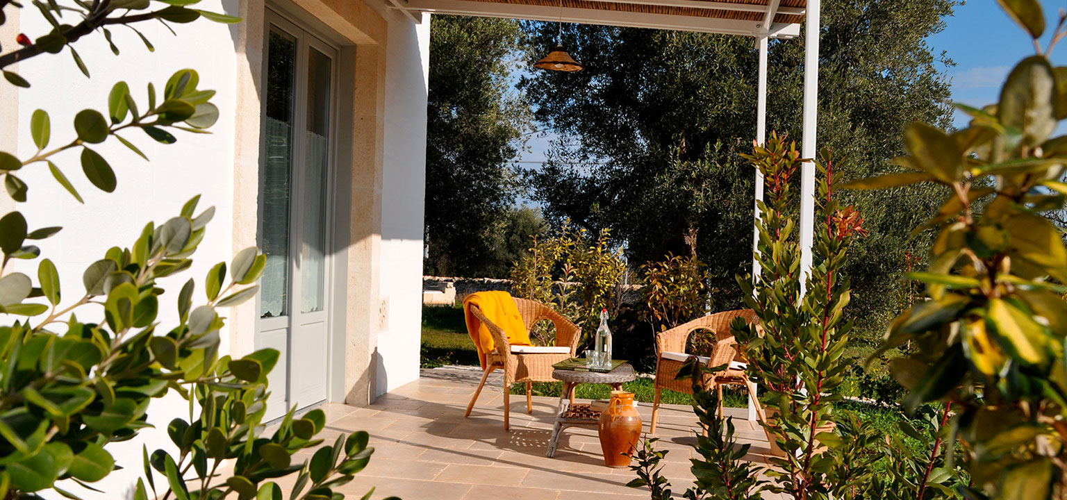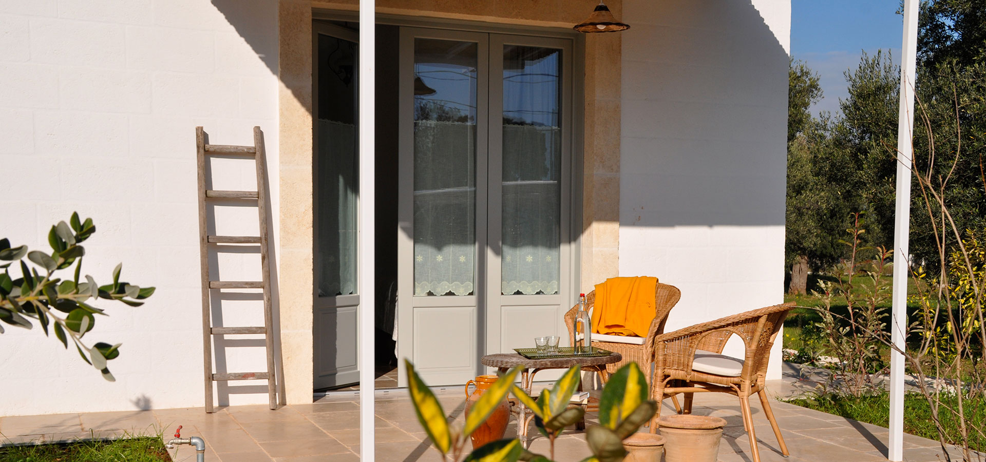 Property includes two houses, one of which is our home, and the other is dedicated to the guests, surrounded by a hectare of olive and ancient carob trees, with twisted and gnarled trunks, and inebriating Mediterranean lentisk and wild thyme. The architecture is typical of the rural houses of the coastal Puglia: simple shapes, thick walls made of whitewashed tufa, local stone floors, wooden windows with reeds shaded against the summer heat.